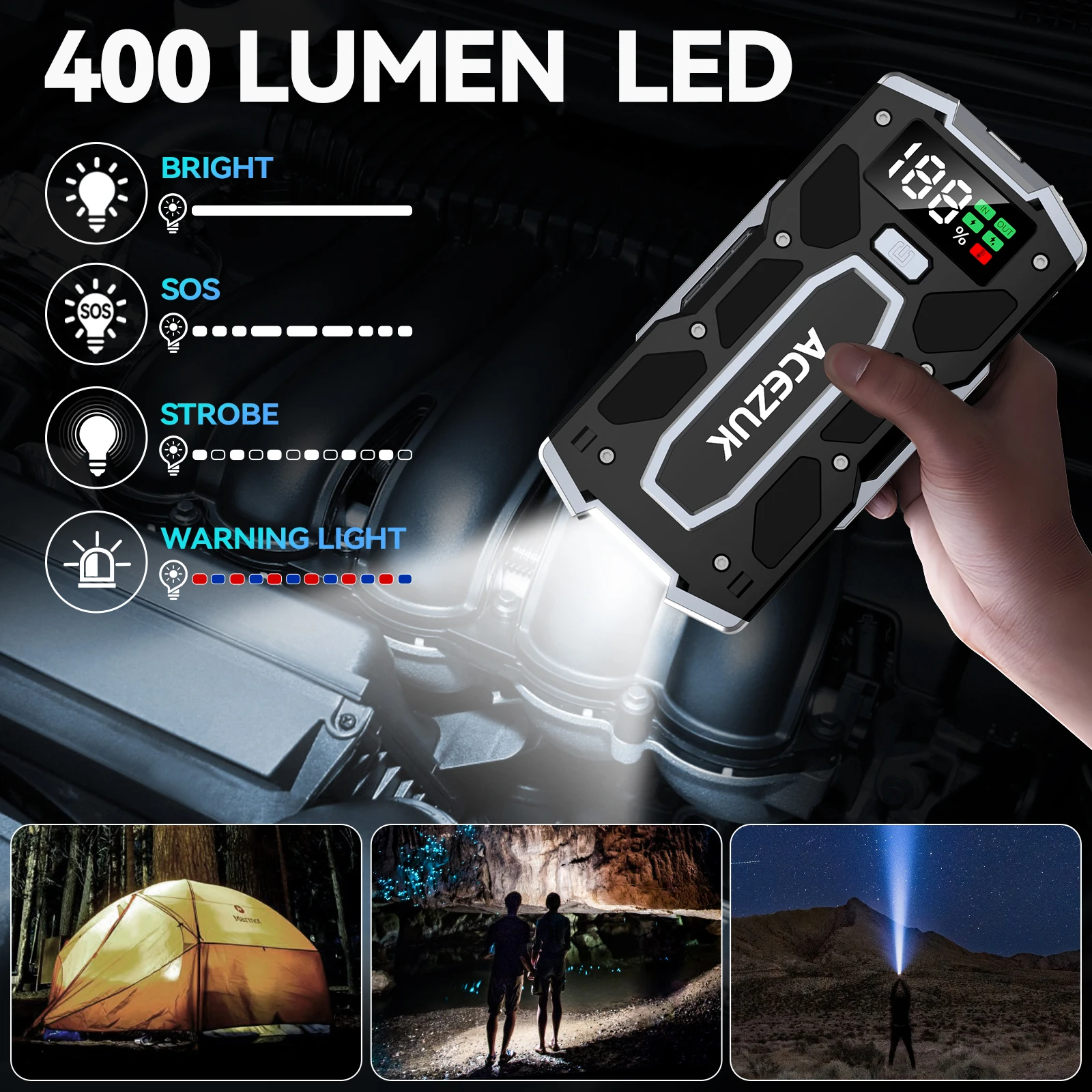 • 5000A peak current: starts 10L gas engines and 8.0L diesel engines instantly • 12V digital display shows real-time battery status and voltage • Smart clip technology ensures safe, secure connections • 400 lumen super bright LED with 4 modes: